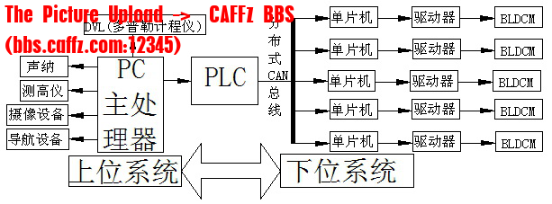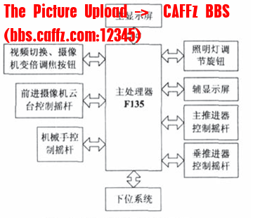小型水下观测机器人主要由人机交互平台、上位系统、下位系统、摄像机四部分组成,操作人员通过有线遥控,结合人机交互界面上的水下视频图像,只需扳动上位系统控制面板上相应的运动控制按钮即可实现对水下机器人的运动控制,操作简单、实用。2-3为水下机器人控制系统框图: