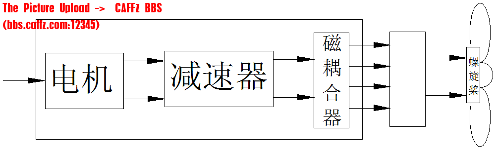采用磁耦合器就是利用电磁力传递扭矩,这样减速器和螺旋桨之间没有直接的机械联系。依据磁场传递扭矩,密封问题很容易解决,只要用非导磁材料将电机、减速器包围起来就解决了动密封难题。采用磁耦合器,推力器的效率略有下降,但性能基本上不受影响。电机的转速与螺旋桨的转速不一定完全匹配,为了得到较高的效率,需要采用减速器,有时为了减小尺寸,采用高速电机(例如采用10000/分以上的高速电机),这时也需要减速器。这样组成的推力器如图2-5所示。