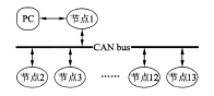 总线型结构的所有节点都共享一个公共的物理通道(即总线)。具有延迟小、速度快、易扩展、单个节点故障影响小的优点。本系统即采用总线型拓扑结构, 系统采用单片机作为控制单元完成机器人控制系统中的各种控制任务(如传感器控制、电机驱动器控制和通信模块控制等)。各功能单元直接挂接在CAN总线上,成为控制网络中的一个节点,从而构成多主机结构,即每个节点均为一个主机,通过CAN通信协议协同完成控制任务。将CAN总线的分布式控制网络应用于水下机器人中。总线上各节点完成不同的任务和功能,它们大部分时间并行工作,必要时通过总线与其他节点进行通信。如图3-1所示。CAN总线是一种多主总线,理论上任何一个节点都可以作为主节点。在控制系统中设置与上位PC机相连的节点1为上位节点,其它节点为底层节点。PC机通过串口与节点1上的CPU通信, CPU再与CAN收发器通信,实现信息在CAN总线上的发送与接收。节点112个底层节点根据应用的不同具有不同的功能,但它们都具有与CAN总线通信的能力,上传数据和接收数据。