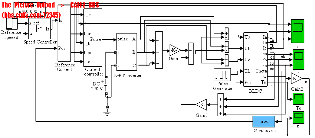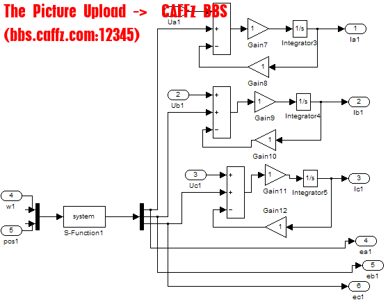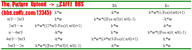 1中:k为反电动势系数(V/(r/min))Pos为电角度信号(rad)w为转速信号(rad/s)。根据电机转过的电角度来求反电动势,用S函数编写。