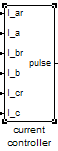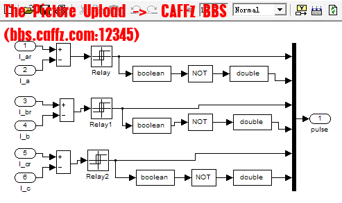 在这个仿真模块中采用滞环控制原理来实现电流的调节,使得实际电流随给定电流的变化。图5-7表示的是滞环型PWM逆变器的工作原理。其工作原理是:当给定电流值与反馈电流值的瞬时值之差达到滞环宽度正边缘时,逆变器的开关管VT1导通,开关管VT4关断,电动机接通直流母线的正端,电流开始上升反之,当给定电流值与反馈电流值的瞬时值之差达到滞环宽度负边缘时,逆变器的开关管VT1关断,开关管VT4导通,电动机接通直流母线的负端,电流开始下降。选择适当的滞环环宽,即可使实际电流不断跟踪参考电流的波形,实现电流闭环控制。模块结构框图如图5-8所示,输入为三相参考电流和三相实际电流,输出为PWM逆变器控制信号。